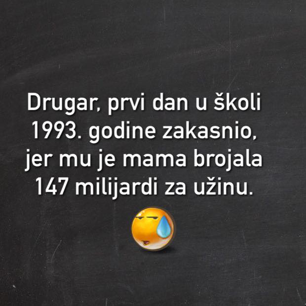 Home INSTA GRAM Kad zakasniš prvog dana u školu zbog užine INSTA GRAM Kad zakasniš prvog dana u školu zbog užine By - 274 0 Share FacebookTwitterPinterestWhatsApp Kad zakasniš prvog dana u školu zbog užine Drugar, prvi dan u školi 1993. godine zakasnio, jer mu je mama brojala 147 milijardi za užinu! Neka bilo, nikad više se ne ponovilo! View this post on Instagram A post shared by naj_lepsi_svecki_citati (@naj_lepsi_svecki)